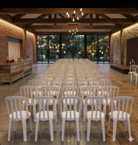 Nossas cadeiras de polipropileno brancas (estilo bistrô) são a escolha perfeita para acomodar um grande número de pessoas com segurança, higiene e praticidade. Elas são leves, resistentes e garantem um visual limpo e organizado, permitindo que o foco esteja totalmente no conteúdo do seu evento.