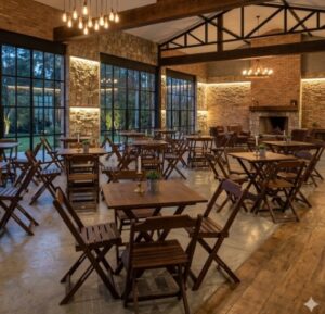 Procurando por aluguel de mesas e cadeiras de madeira para o seu evento? O nosso conjunto boteco é a escolha ideal para quem busca praticidade e um visual rústico autêntico. Perfeito para churrascos, aniversários temáticos e festas de confraternização.
